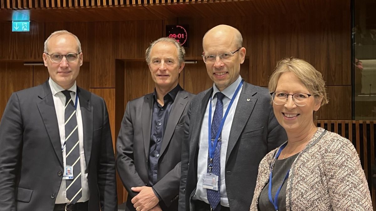 Suomen ryhmä kalastuskiintiöistä päättäneessä istunnossa: Vas,. pysyvän edustajan sijainen Lauri Hirvonen, kalastusvirkamiehet Orian Bondestam ja Risto Lampinen sekä ministeri Sari Essayah.