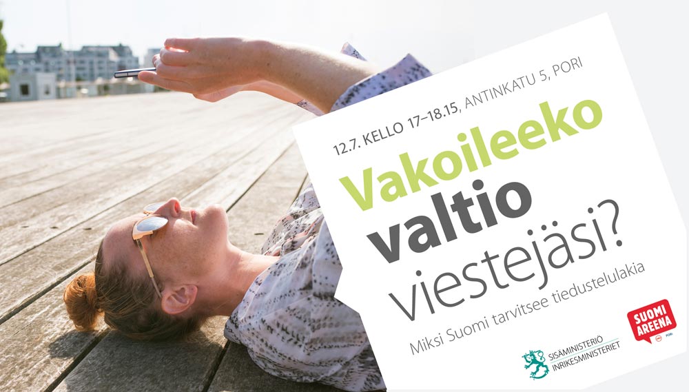 Sisäministeriön keskustelu Vakoileeko valtio viestejäsi? Miksi Suomi tarvitsee tiedustelulakia keskiviikkona 12. heinäkuuta kello 17–18.15, Antinkatu 5, Pori. Voit seurata keskustelua Twitterissä #tiedustelu ja suorana lähetyksenä osoitteessa www.suomiareena.fi