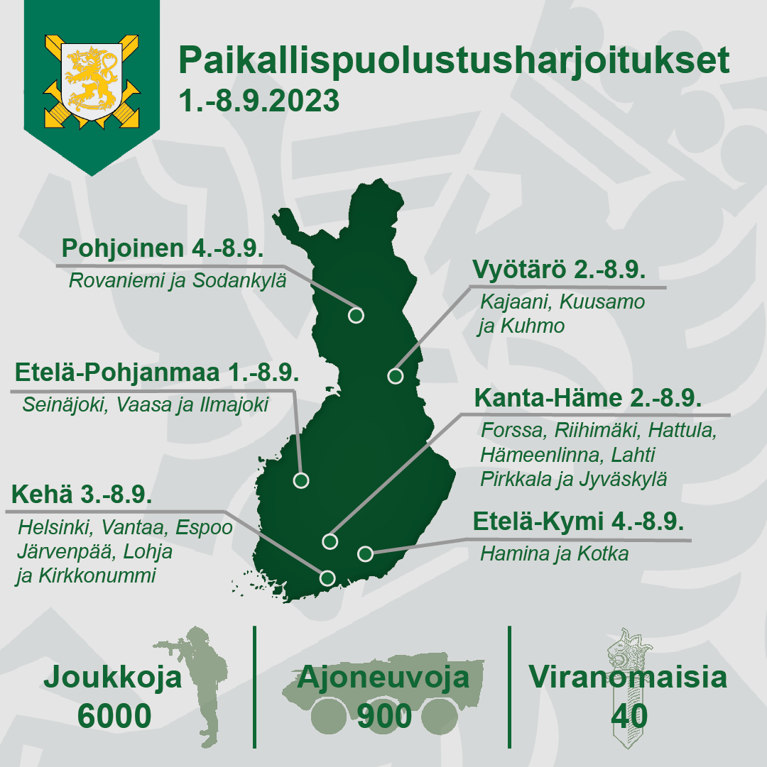 Paikallispuolustusta harjoitellaan koko maan alueella 1.–8. syyskuuta. Harjoitukset kehittävät yhteistä turvallisuutta, viranomaisyhteistyötä ja kykyä varautua häiriötilanteisiin eri puolilla Suomea. Yhdessä harjoitellaan esimerkiksi erilaisia pelastustoimintaan ja väestönsuojeluun liittyviä tilanteita.