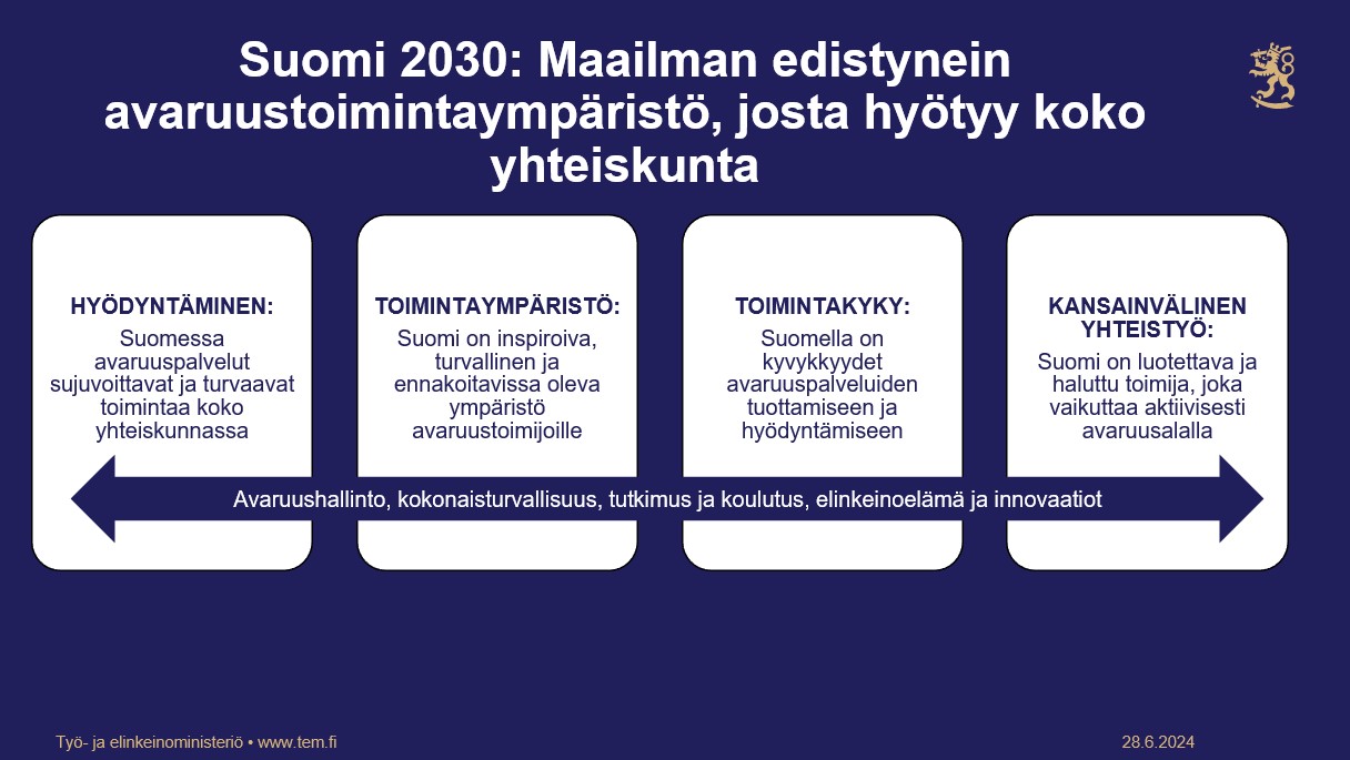 Jotta avaruuspalveluita kyetään tuottamaan ja hyödyntämään, tarvitaan osaamista, tutkimustietoa sekä mahdollistava toimintaympäristö. Yksityisen ja julkisen sektorin välinen yhteistyö on tässä keskeistä. Rajallisten resurssien puitteissa on tunnistettava kyvykkyydet, joita voimme kansallisesti kehittää. Näitä voidaan tukea kansainvälisen yhteistyön kautta hankittavilla palveluilla.