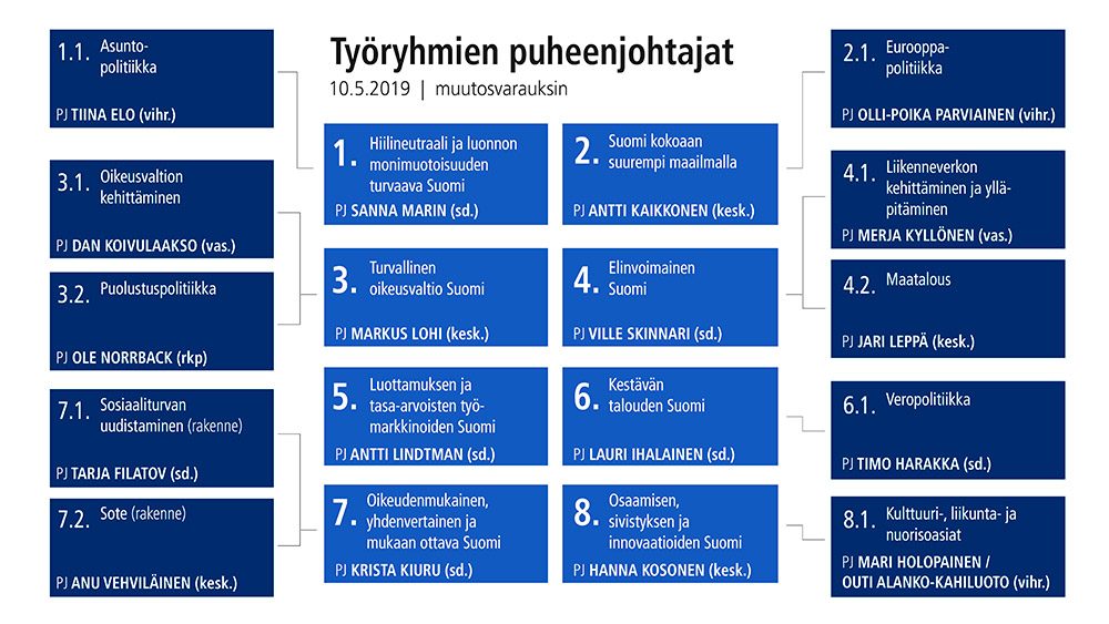 (Päivitys 21.5.2019 klo 12.00. Lisätty Satu Mäki-Lassila (kesk.) ryhmään Poliittinen asiantuntijaryhmä. Päivitys 20.5.2019 klo 8.00. Lisätty Elias Kiljunen (sd.) ryhmiin Kestävän talouden Suomi ja Veropolitiikka ja Tuomo Puumala (kesk.) ryhmään Osaamisen, sivistyksen ja innovaatioiden Suomi.)