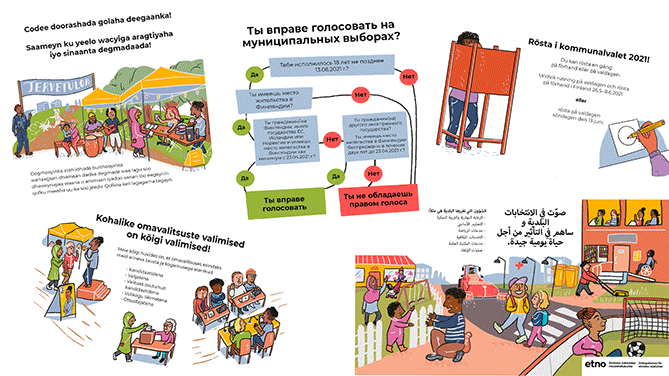 Delegationen för etniska relationer (ETNO) har publicerat valmaterial på sju språk för att sprida information om kommunalvalet i Finland. Med hjälp av det visuella materialet uppmuntras flerspråkiga kommuninvånare att påverka och rösta i det kommande kommunalvalet.
