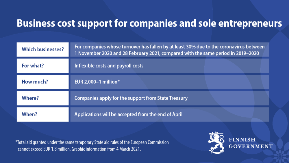 Support for business costs is one way for the Government to help companies during the coronavirus situation. With the help of previous support from Business Finland and ELY Centres, companies were able to develop and redirect their operations in the coronavirus situation. Other forms of support include Business Finland’s research, development and innovation loans, Finnvera’s guarantees and the financing programmes of Finnish Industry Investment Ltd, where applications are still accepted. The Government also proposes that the right of entrepreneurs to receive labour market support continue due to the coronavirus pandemic. Other previous forms of aid include special support for the food and beverage services sector and sole entrepreneurs.
