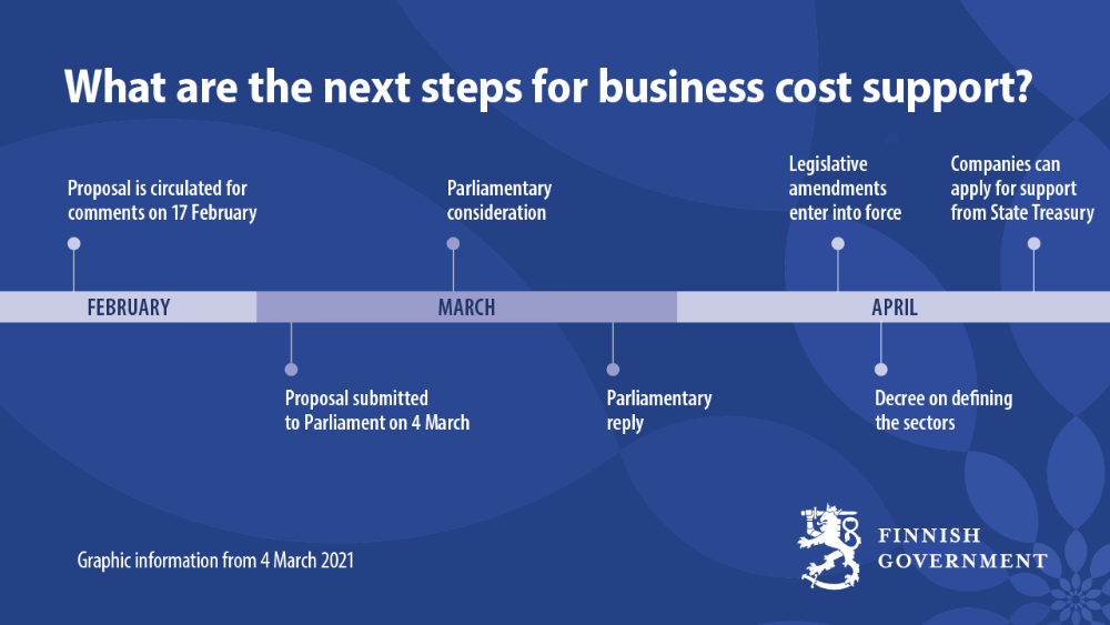 The Act on Support for Business Costs may be amended as a result of the reasonable compensation provided to businesses affected by the closure. The amendments will be submitted either as a supplementary Government proposal during the Parliamentary committee discussions or as a separate proposal, depending on the progress of the preparation.