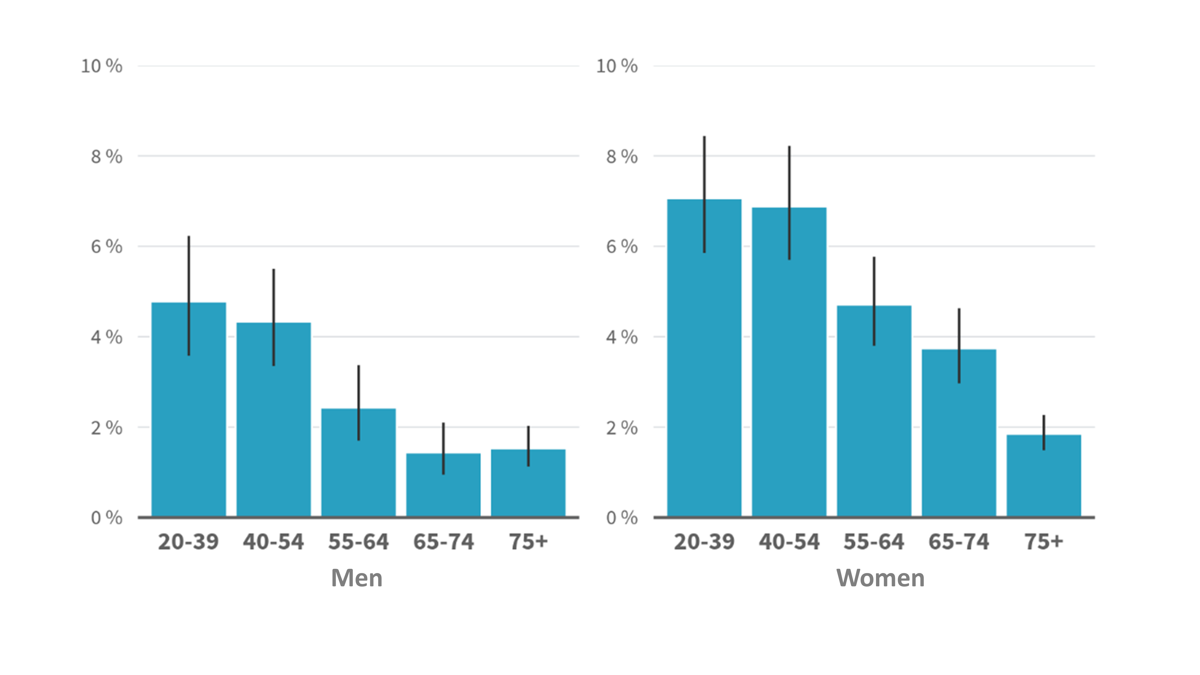 2.0% of women and 1.2% of men had experienced physical intimate partner violence in the past year. Women aged 20–39 reported the most physical intimate partner violence: 3.2% of them had experienced physical violence in their relationship.