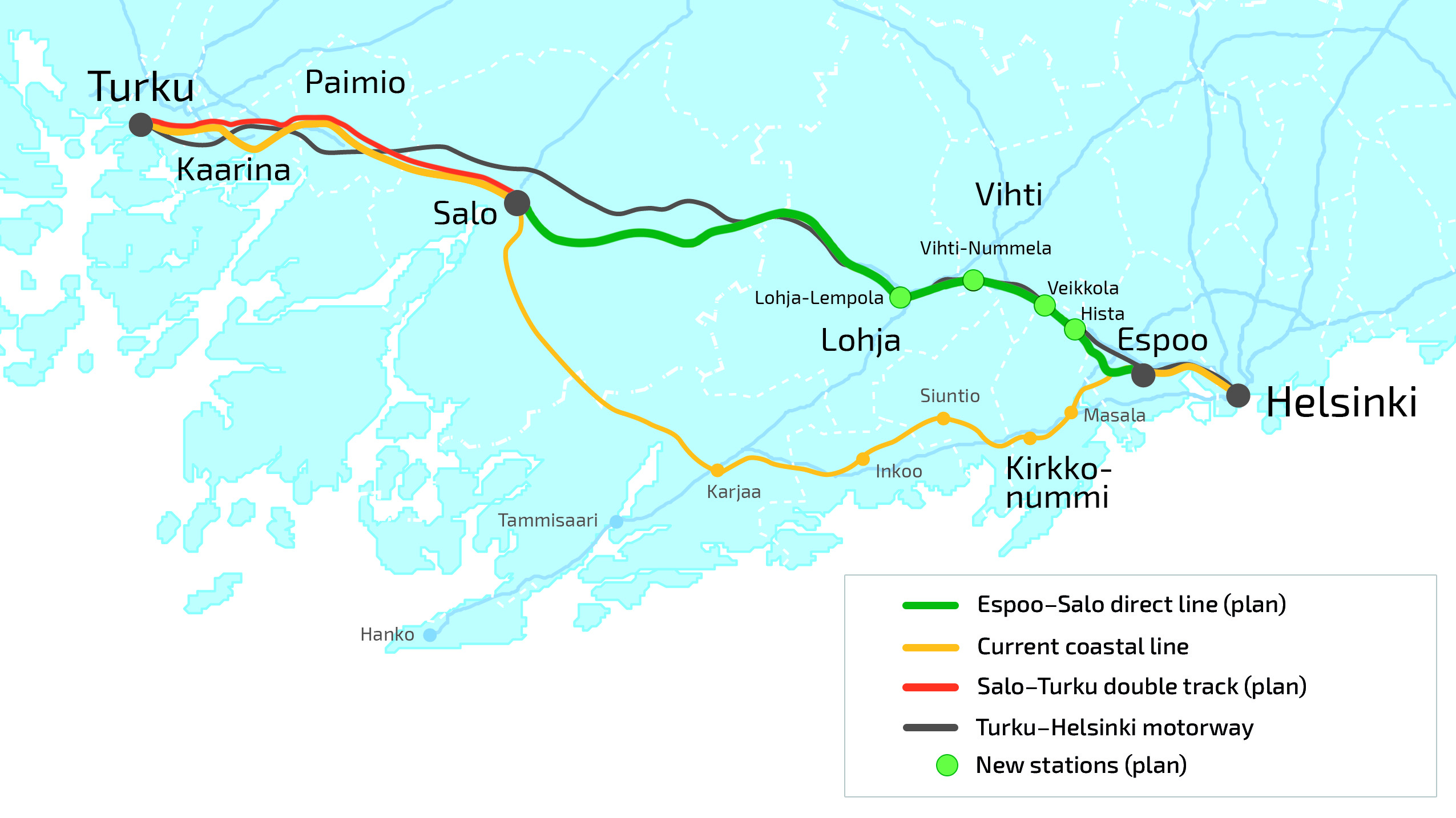 The aim of the high-speed rail link between Helsinki and Turku and the Espoo-Salo railway line is to shorten the travel time between Helsinki and Turku. The new rail link makes it possible to speed up long-distance traffic by about half an hour and to start commuter traffic between Helsinki and Lohja. The current shore track would have the same type of commuter traffic. Benefits from the significant reduction in the travel time between Helsinki and Turku will only be obtained when the Espoo–Salo direct line is in use.