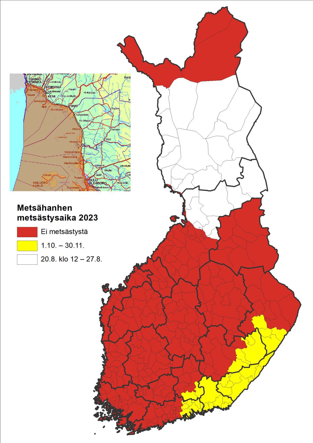 Metsähanhen metsästys on sallittu edellisen vuoden mukaisesti alkaen 20.8. kello 12 ja päättyen 27.8.2023 Lapin maakunnassa, lukuun ottamatta Enontekiön, Inarin ja Utsjoen kuntia ja valtatien E8:n merenpuoleisia alueita. Sen lisäksi tänä vuonna metsästys on sallittu Pohjois-Pohjanmaan maakunnassa Iin, Muhoksen, Kuusamon, Oulun, Pudasjärven, Utajärven, Taivalkosken ja Vaalan kunnissa, mutta Iin ja Oulun kunnissa metsästys on kielletty valtatie E8:n merenpuoleisilla alueilla sekä Muhoksen, Oulun, Utajärven ja Vaalan kunnissa valtatie 22:n etelänpuoleisia alueilla. Pohjois-Suomen pesimäalueen metsästyksessä metsähanhia ei saa metsästää pelloilla eikä käyttää metsästyksessä keinotekoista ravintohoukutinta. Metsästystä koskee lisäksi metsästäjäkohtainen yhden metsähanhen vuosittainen saaliskiintiö. Rajoitusten tarkoituksena on sallia ensisijaisesti perinteinen pesimäsoilla tapahtuva pyynti, mutta samalla varmistaa, että metsästys ei ole liian tehokasta, jotta Suomen oman pesimäkanta elpyisi.