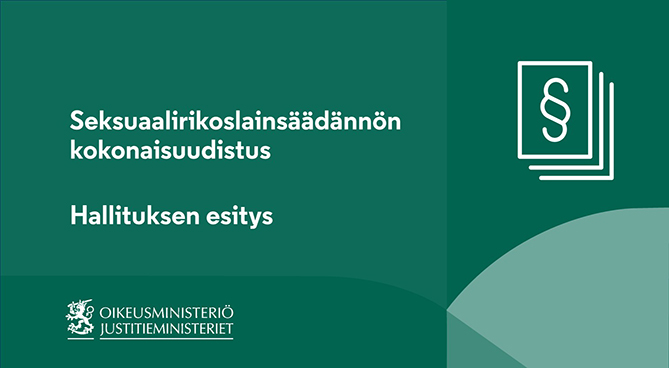 Hallitus on antanut tänään esityksen rikoslain seksuaalirikossäännösten uudistamisesta. Uudistuksen tavoitteena on vahvistaa jokaisen seksuaalista itsemääräämisoikeutta ja henkilökohtaisen koskemattomuuden suojaa. Samalla mittava uudistus yhdenmukaistaa ja selkiyttää rikoslain seksuaalirikoksia koskevan sääntelyn. Lakiesitys perustuu pääministeri Sanna Marinin hallitusohjelmaan.